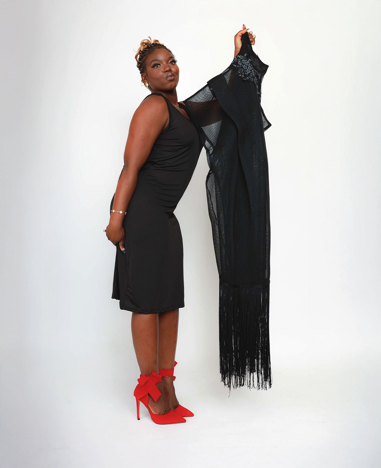 Command attention in the Noir Fringe Ensemble — a daring two-piece set that blends sleek minimalism with dramatic flair. Featuring a curve-hugging black dress and a sheer mesh overlay adorned with delicate beadwork and flowing fringe, this look was made for magnetic entrances and unforgettable exits.